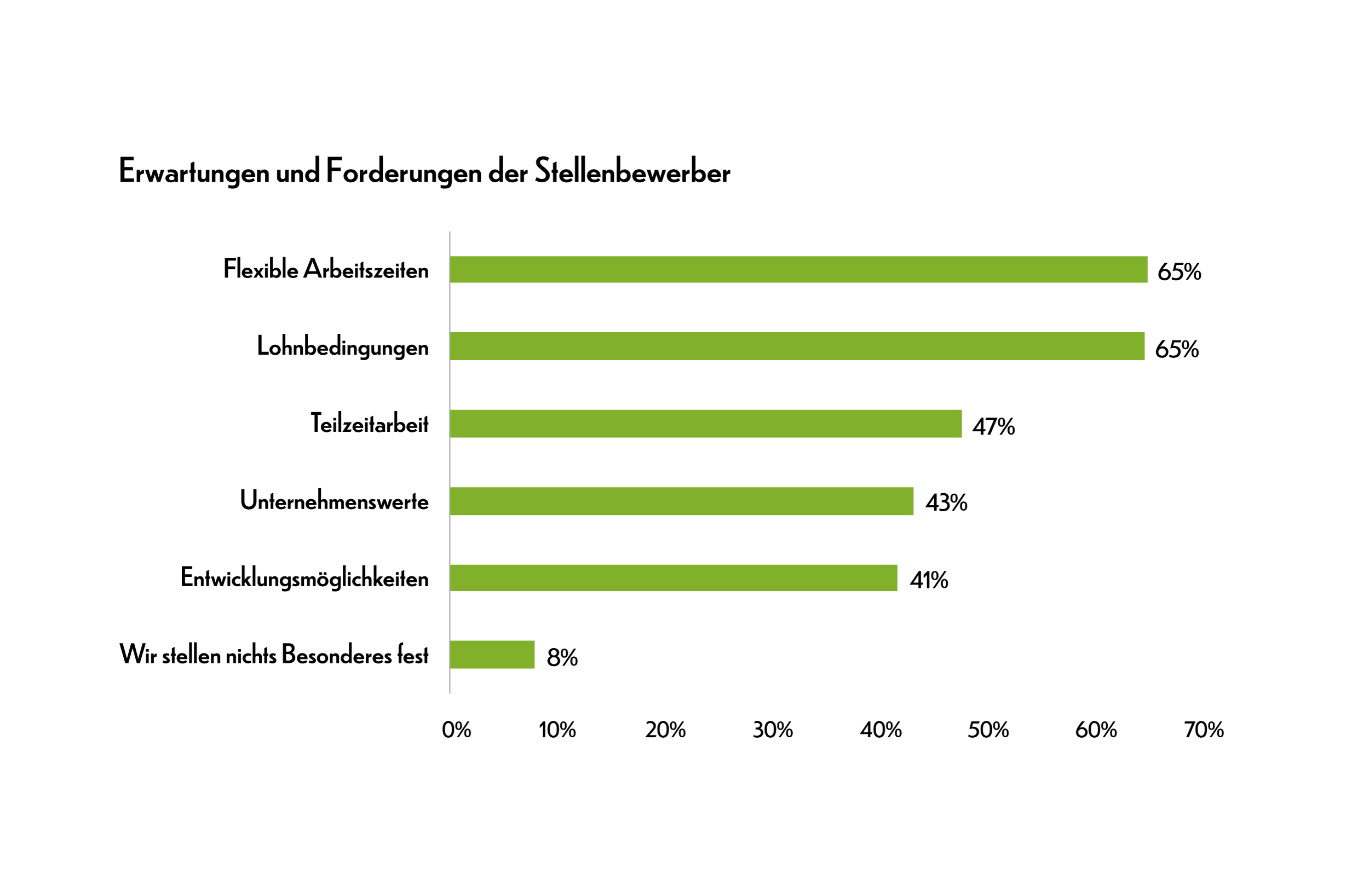 Diese eingeführten Vorkehrungen entsprechen zum Teil den Erwartungen der Kandidaten, die sich bei Freiburger Unternehmen bewerben. Gemäss den Ergebnissen der Umfrage erkundigen sich Personen in Vorstellungsgesprächen in zwei Drittel der Fälle nach den Lohnbedingungen und der Möglichkeit, die Arbeitszeiten flexibel zu gestalten. Fragen nach Möglichkeiten für Teilzeitarbeit werden in einem von zwei Fällen gestellt.