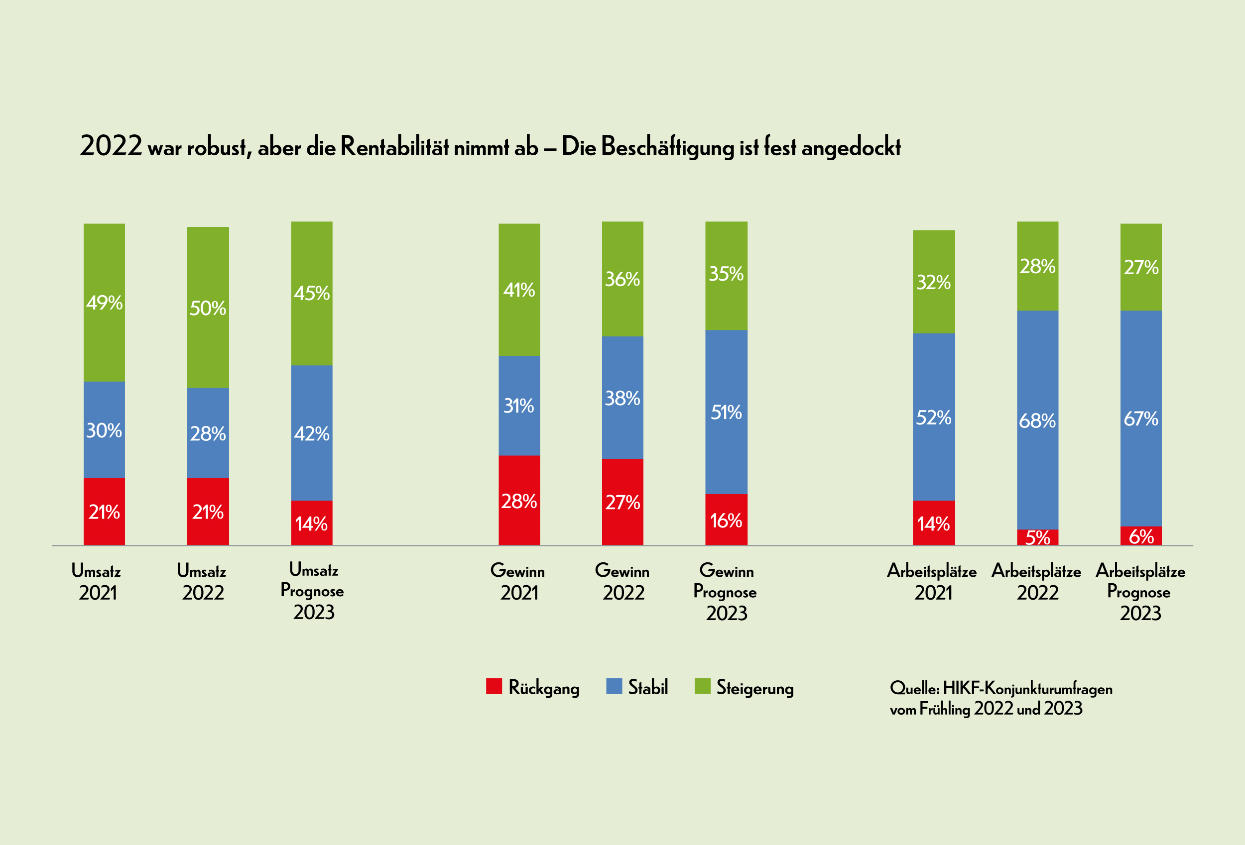 Entgegen den Erwartungen, die auf eine verstärkte Verlangsamung im Verlauf des Jahres 2023 setzten, verlief das erste Quartal auf einer weiterhin soliden Basis. Die Unternehmen erwarteten zu diesem Zeitpunkt entweder ein stabiles (45% der HIKF-Mitgliedsunternehmen) oder ein weiter ansteigendes (38%) Geschäftsjahr. Die Verlangsamung – in Sachen Auftragsvolumen – wird somit für das zweite Semester erwartet und dürfte in bestimmten Branchen markanter ausfallen, insbesondere im Detailhandel. Trotz dieses unsicheren Umfelds zeigt die Beschäftigung weiter stark nach oben: Der Anteil von Unternehmen, die den Personalbestand erhöhen wollen (26%), ist deutlich höher als jener von Unternehmen, die sich gezwungen sehen, Personal abzubauen (6%).
