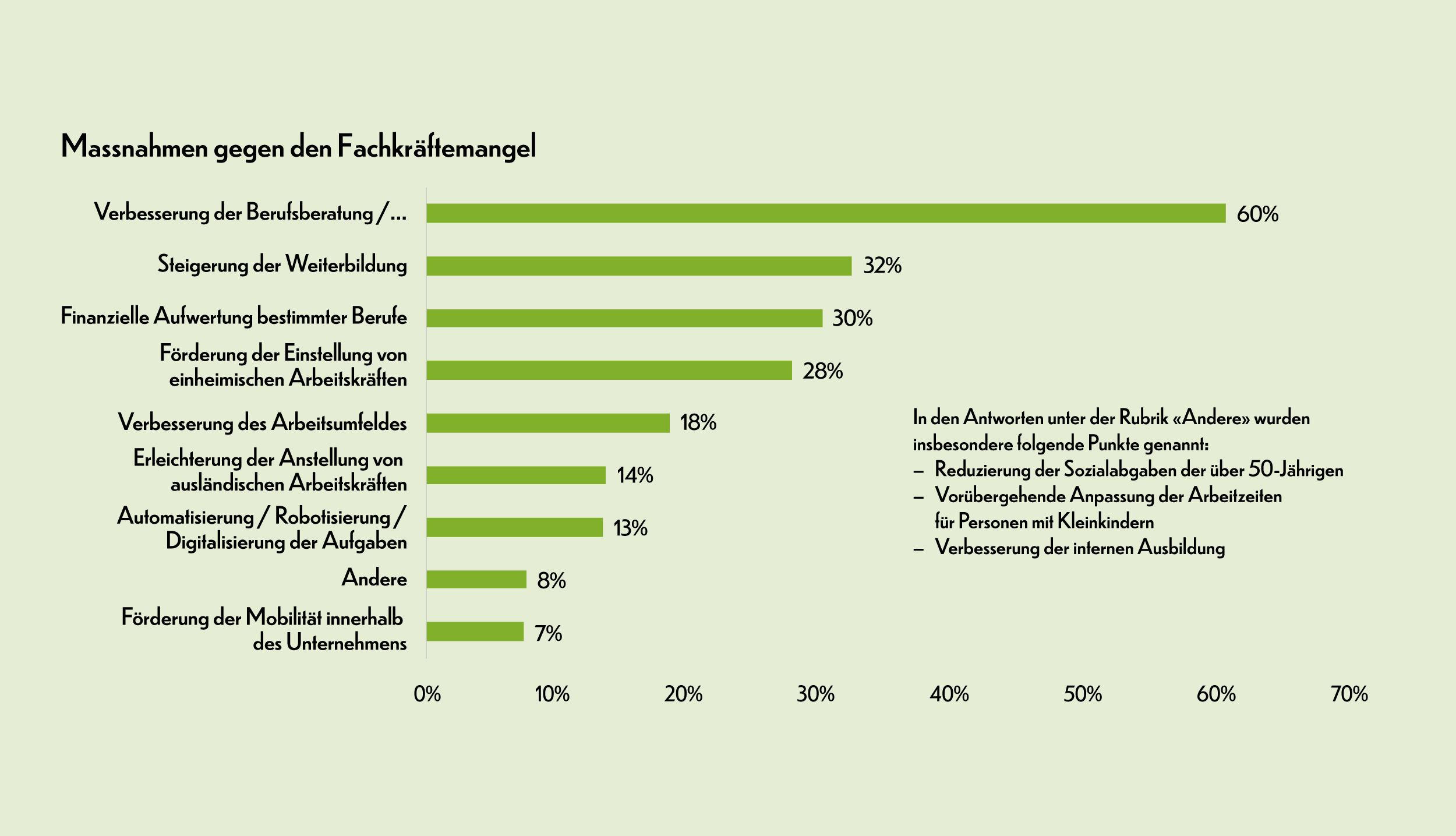 Auch wenn es keine Patentlösung gibt, um die Situation in Sachen Fachkräftemangel zu verbessern, gibt es eine, die unter den Freiburger Arbeitgebern einen breiten Konsens findet: Die Verbesserung der Berufsberatung und die Aufwertung bestimmter Ausbildungsgänge. 60% der HIKF-Mitgliedsunternehmen, die an der Umfrage teilgenommen haben, zitieren diese Massnahme, weit vor der Verstärkung der Weiterbildung (32%), der finanziellen Aufwertung bestimmter Berufe (30%) oder auch der Massnahmen zur Förderung der Anstellung einheimischer Arbeitskräfte (28%).