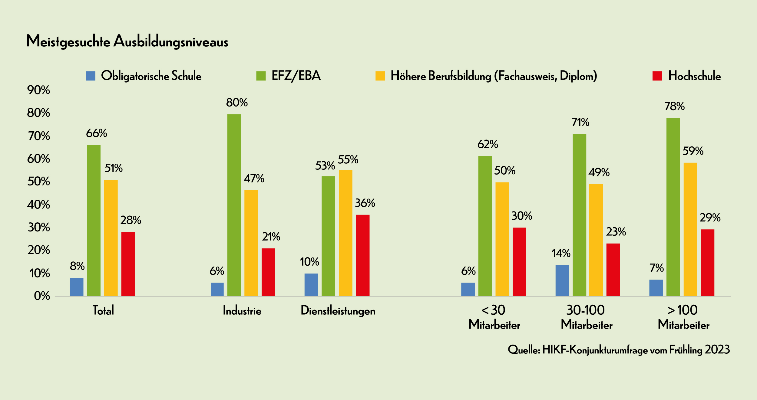 Welche Profile fehlen bei Unternehmen am meisten? Die Ergebnisse der HIKF-Umfrage zeigen, dass es vor allem Personen mit einem EFZ sind, die am dringendsten gesucht werden. Aber auch der Mangel an Absolventen von Hochschulen (Fachhochschulen und Universitäten) ist beträchtlich. Einzig Personen ohne spezifische Ausbildung sind auf dem Arbeitsmarkt leichter zu finden.